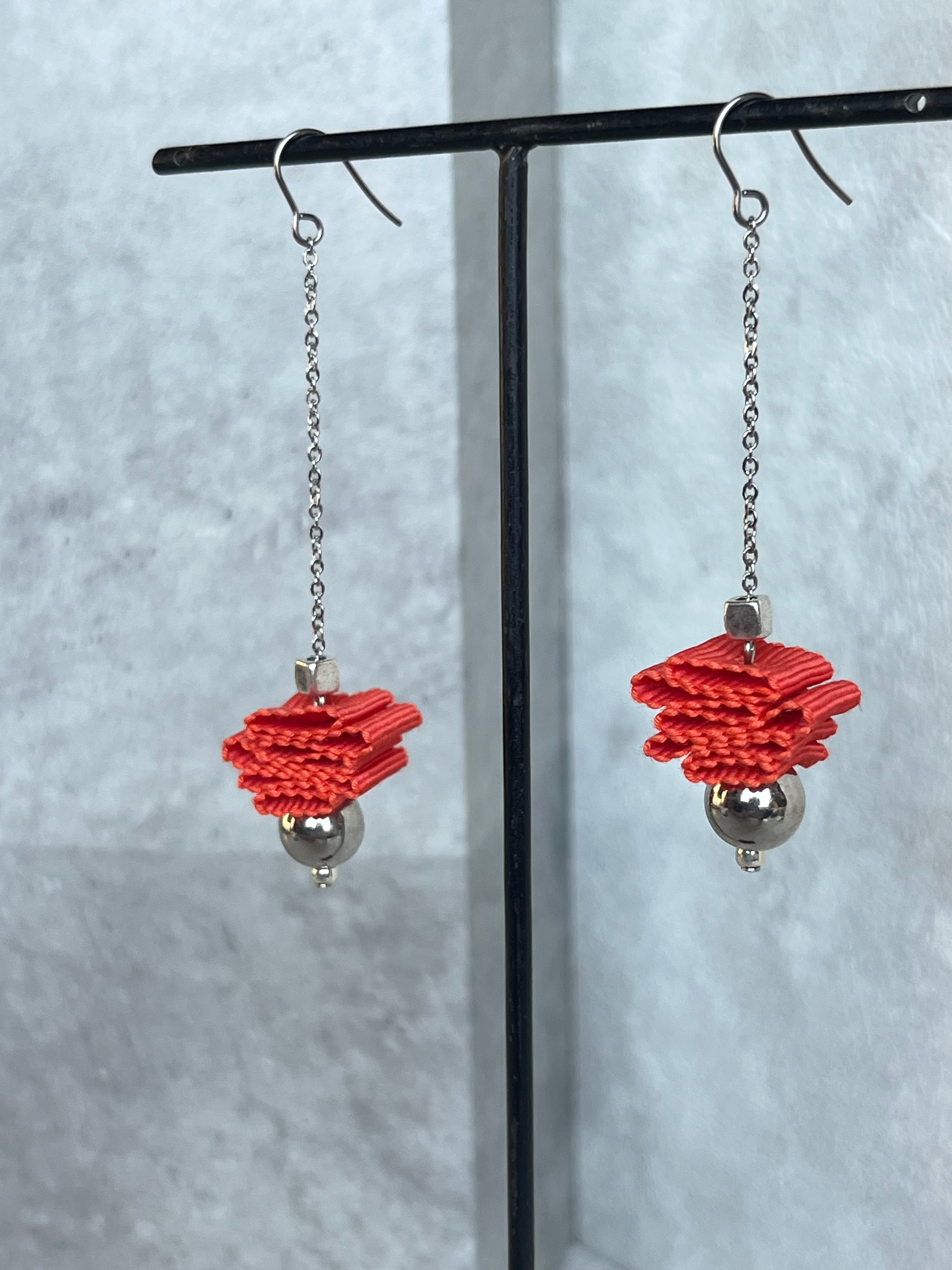 ランダムに折り重なるように小さく畳まれたリボンが華奢なチェーンの先でゆらゆら揺れるデザイン。