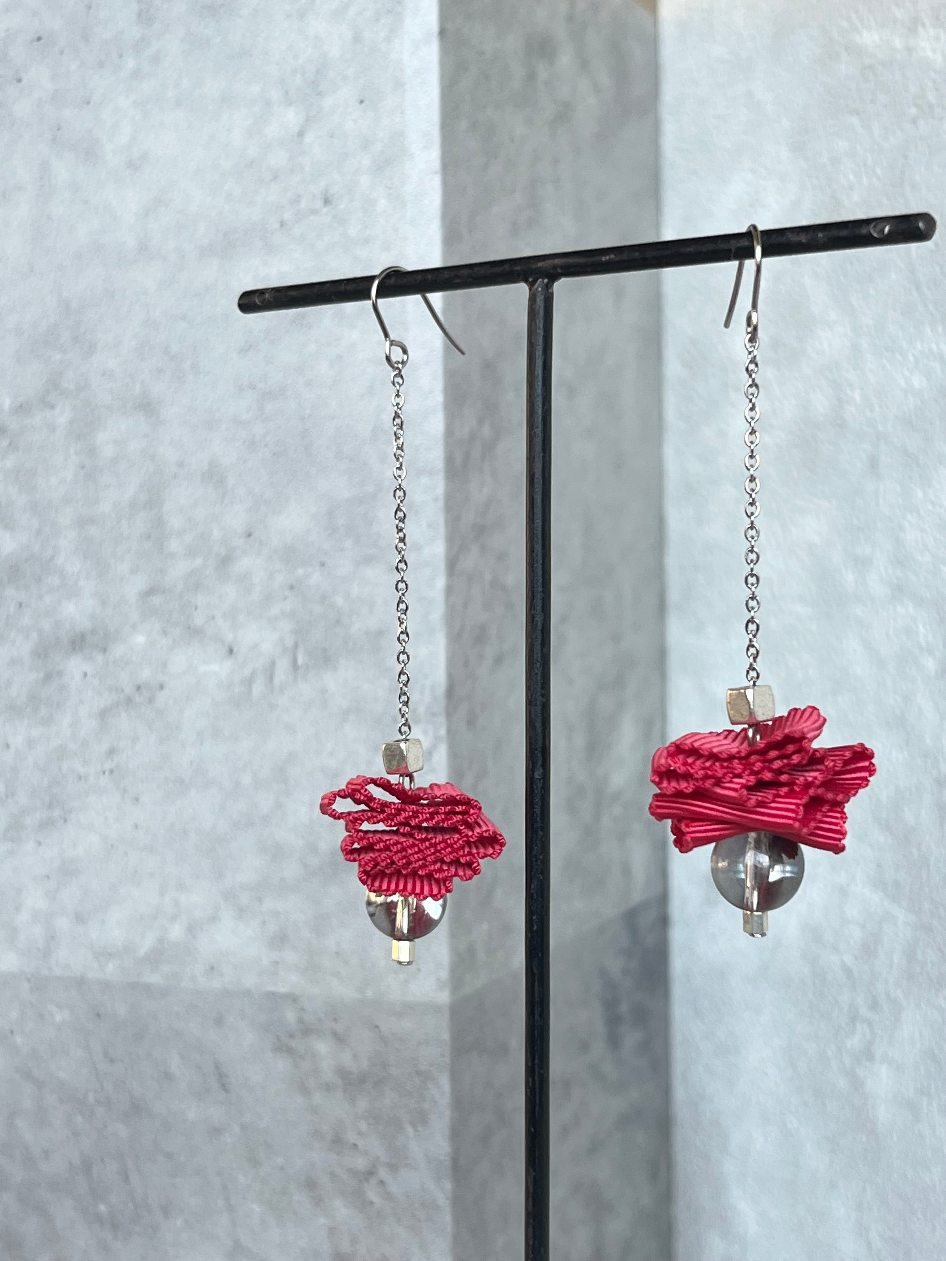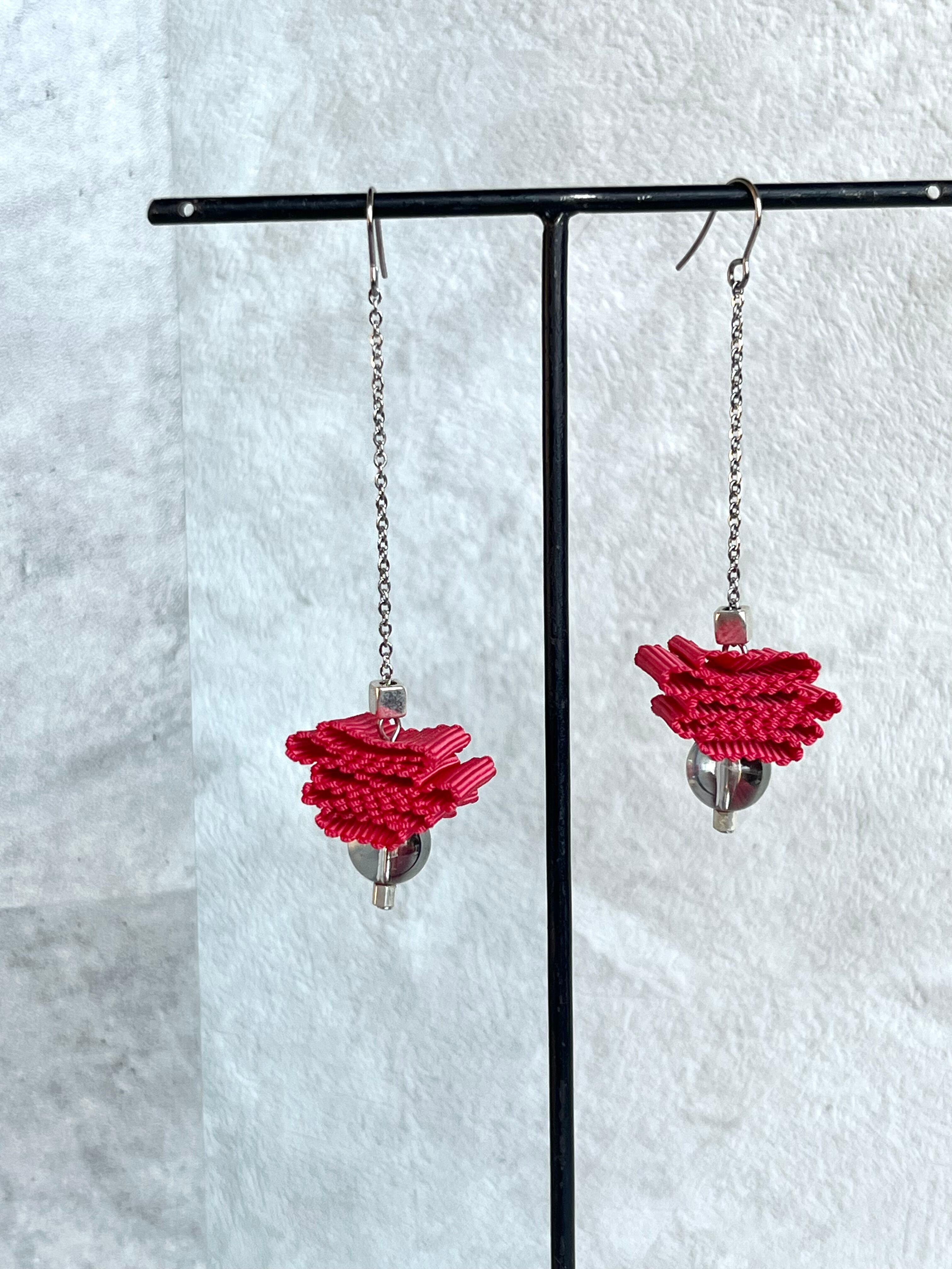ランダムに折り重なるように小さく畳まれたリボンが華奢なチェーンの先でゆらゆら揺れるデザイン。